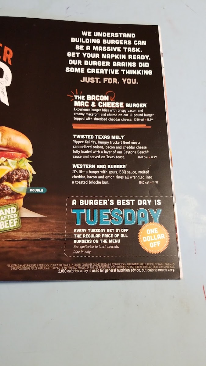 Two 1/4lb. burgers with Daytona beach sauce, caramelized onions, bacon and cheddar cheese served on Texas toast. 1020 cal